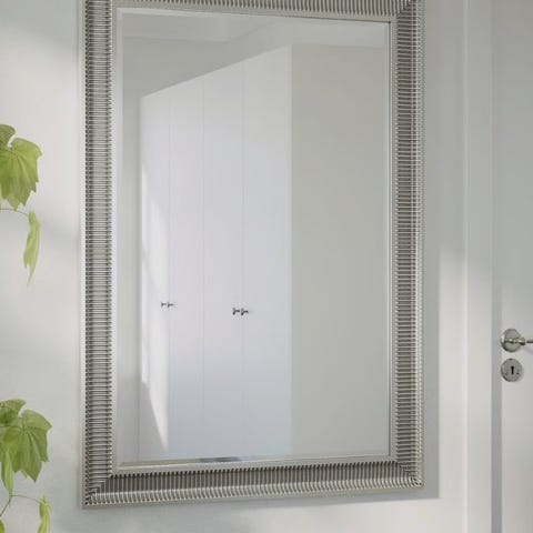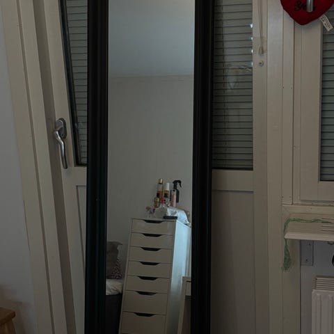 IKEA spegel i rektangulär form. Spegeln är insvept i skyddande plast och har en ram i ljus färg. Passar för väggmontering och kan användas i olika rum för att förstora och ljusa upp ytor.
