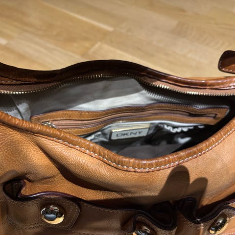 DKNY läderväska för kvinna i beige färg. Väskan har kedjedetaljer och två bärremmar. Materialet är läder, vilket ger en hållbar och stilren design. Passar för vardagligt bruk och olika tillfällen.
