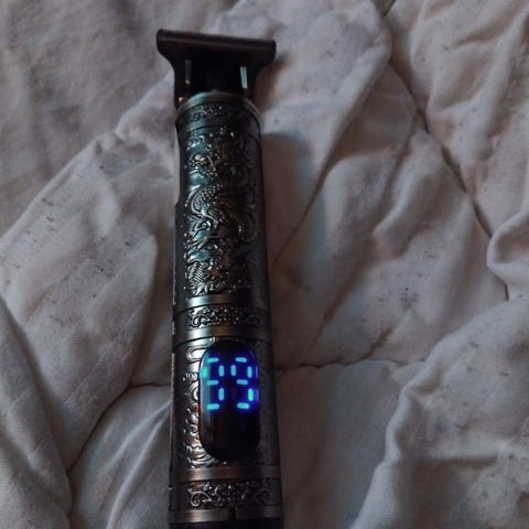 Graham Hill Trimmer elektrisk i blå färg. Inkluderar laddningsstation och strömadapter. Handhållen design för enkel användning.
