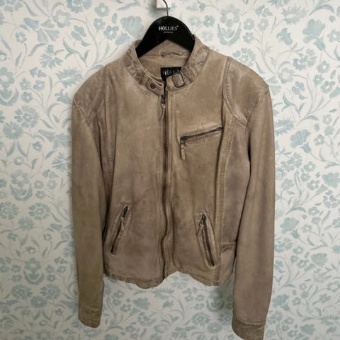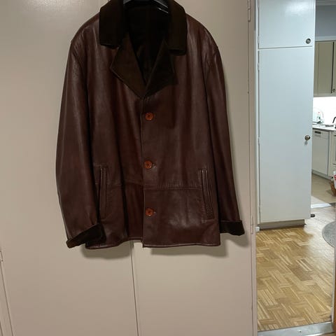 Snygg lammskinns jacka, 60 cm lång, och 104 cm runt bysten, med polyester foder, röd. I skick som ny.