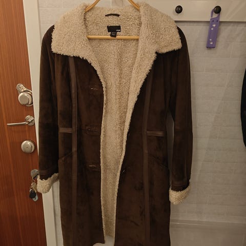 Brun läder kappa i storlek L, 42. Ytterplagget är tillverkat av läder och har detaljer i päls, inklusive foder av kaninpäls. Varm och skön i kylan !