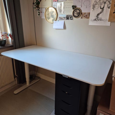 Säljer fin ikea skrivord. Skick som ny och fungerar som ny, tyst och stabil. Finns i HÄSSELBY. Benet bortmonteras med 12 skruv för enkel transport. Tillgänglig 24/7.
