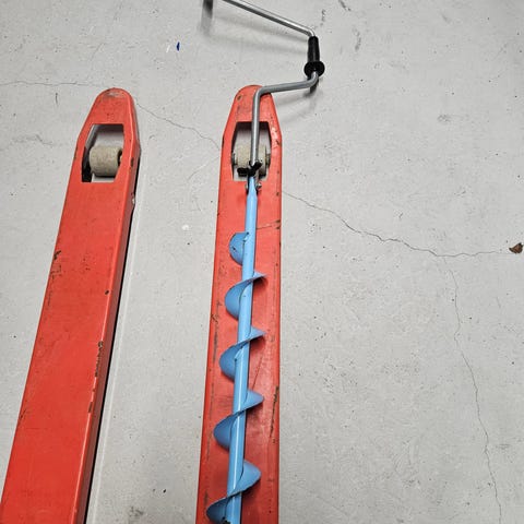 Isborr med blå spiral och röda handtag. Handdriven borr för att göra hål i is för exempelvis isfiske.