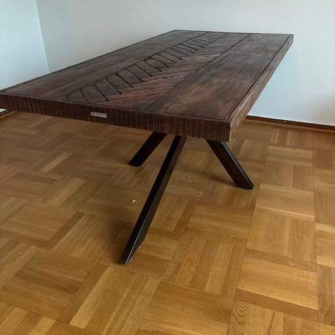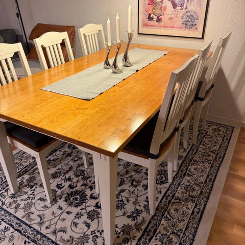 Vackert matsalsbord med dolda iläggs skivor. Mått total längd 251 cm ihop fällt 140 cm. Bredd 109 cm.