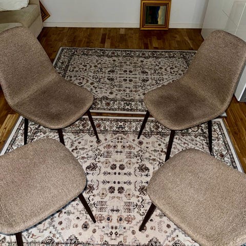 4 likadana stolar säljes med anledning av flytt. Stolarna köptes i början av 2025 och har sedan dess sparsamt använts. Därav är stolarna fräscha och i mycket bra skick.