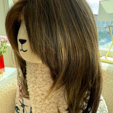 A short dark-blond wig from synthetic hair. Good condition but it can use a bit of fixing (some hairs could be added next to the part line). Was purchased for 5500 SEK.