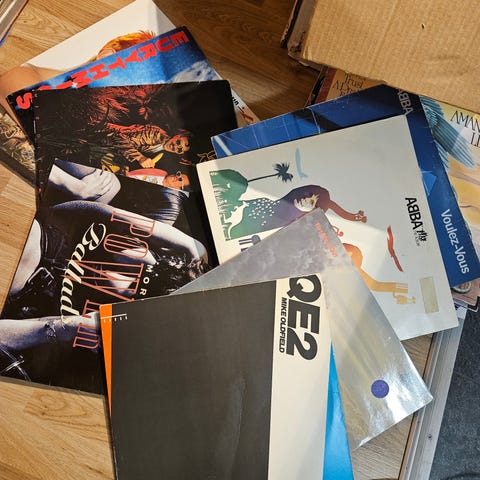Tre vinylskivor med musik av bandet Oasis. Skivorna innehåller olika album och är avsedda för uppspelning på skivspelare.