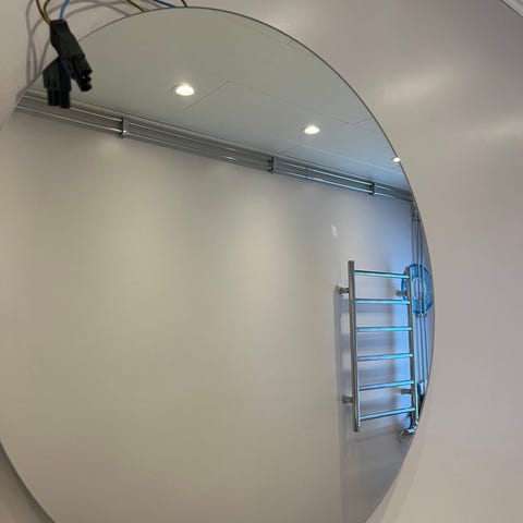 Hafa Store badrumsspegel med fin och praktisk hylla framför spegeln samt integrerad belysning.