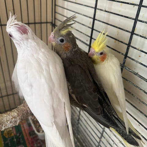 Säljer mina Nymfparakiter. Just nu har de ett ägg. Brukar lägga 8 ägg per år. De är Tama men rädd av människor. De äter från handen. Säljs med bur. Finns i Malmö