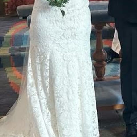 Super fin bröllopsklänning endast testad inomhus och har en prislapp på 23000 kr, kvitto finns tyvärr inte kvar. Vill du ha en elegant och tidlös klänning är detta en bra match för dig i storlek 38-44. Klänningen har snörning i ryggen och går därför att reglera i storleken. Modellen är 179 cm lång och bär inga klackar och är en M/38-40 i klädstorlek.