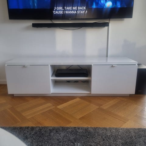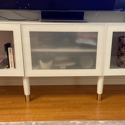 Säljer en svart Ikea tv bänk. Två glas dörrar och en glas skiva ovanpå.