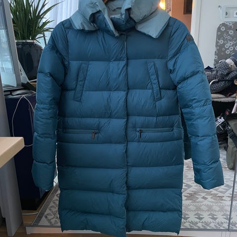 Ahkka vinterjacka i blå färg, tillverkad av dunmaterial. Jackan är i damstorlek 38 och designad för att ge värme och komfort under kalla förhållanden.