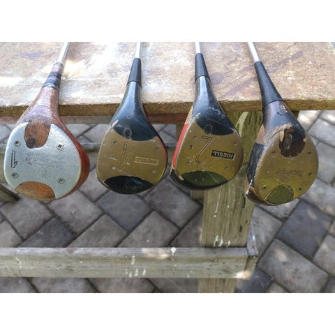 Sedan är det 7 träklubbor från cirka 1930. Inga klubbor har hickoryskaft.