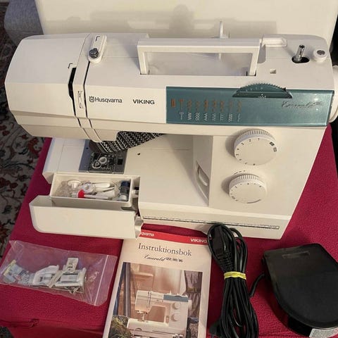 Husqvarna Viking Quilting 545 symaskin med inbyggd digital display och tangentbord för val av sömmar. Maskinen har flera sömnadsfunktioner och mönster, inklusive dekorativa stygn. Tillbehör som manual och extra delar medföljer.