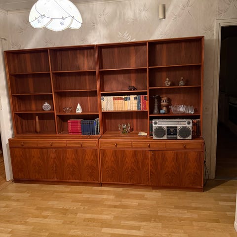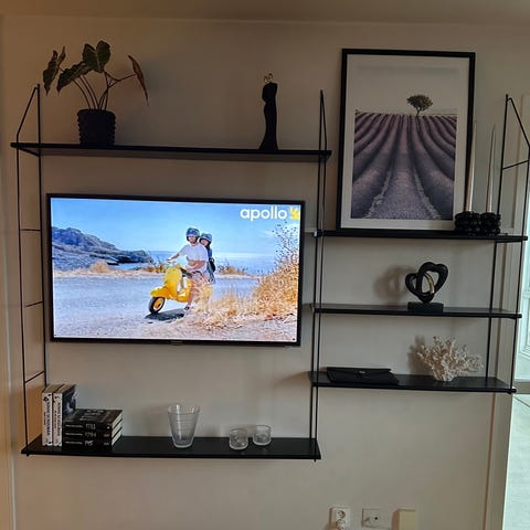 Hyllplanen sitter med grafikgrå elfahyllor i vägg. Den modell som sälges är en låda bredare än den på bilden och har några extra hyllplan man kan sätta bredvid TVn. Den som är till salu är enligt bifogad ritning. Djupet är 35cm, bredd 2,6m och höjden kan man själv variera eftersom den sitter på elfakonsoller.