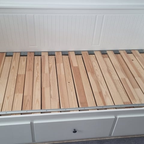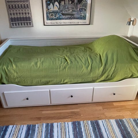 Säljer en stabil och praktisk IKEA dagbädd / barnsäng köpt runt 2013. Inklusive ribbotten och skummadrass.