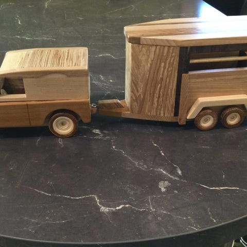 Handgjord träleksak traktor med släp i naturfärgat trä. Består av en traktor och en kopplad släpvagn. Leksaken är tillverkad i trä och har rörliga hjul. Passar som samlarobjekt eller leksak för barn.längd totalt 60 cm.