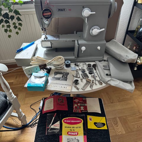 Pfaff 360 symaskin med flera sömmöjligheter, inklusive dekorativa stygn. Maskinen är mekanisk och har en robust konstruktion. Den är utrustad med fotpedal och tillbehör för olika sömnadsprojekt. En mycket kraftfull symaskin som klarar av att sy tjockare tyger.