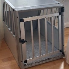 Hundbur i svart stål med gallerdesign för ventilation och säkerhet. Passar för transport eller säker förvaring av hundar.