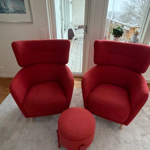 Fåtöljen köptes i maj 2023 och har använts mycket sparsamt. Den är i mycket gott skick och ser ut som ny. Fotpall ingår.