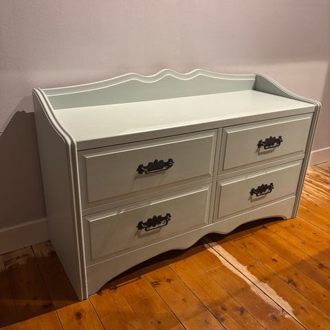 Farstumöbel spegel och byrå i brunt trä med mässingdetaljer antagligen 70-tal i originalskick inga skador.