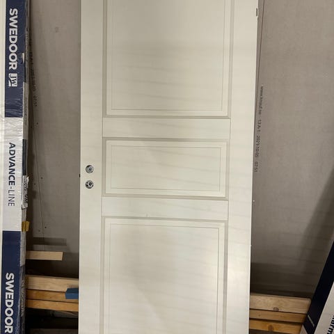 Swedoor Innerdörr i trä med vit färg. Dörren har klassisk design med paneler och metallbeslag. Passar för inomhusbruk.