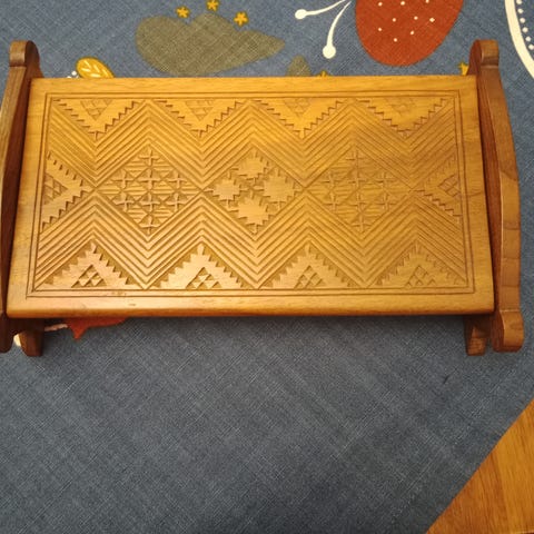 Rund träask med lock, tillverkad av olika träslag. Asken är sammansatt av små träbitar som bildar ett mosaikmönster. Locket har ett litet handtag för enkel öppning. Passar för förvaring av små föremål.skålen är 9cm hög 15 cm diam.