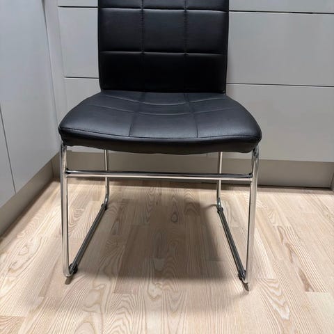 Matstol med vadderad sits och ryggstöd med svart konstläderklädsel. Ben i krom.