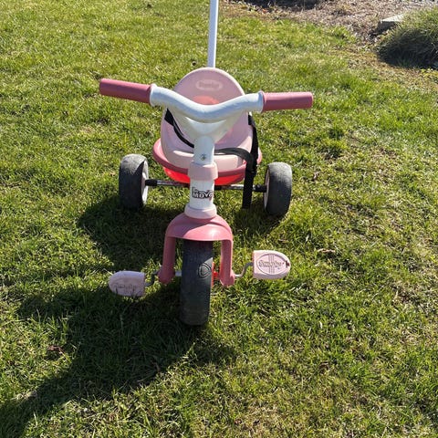 Winther Tricycle trehjuling med styrstång och korg. Den har en ram i grönt, rosa framhjul och korg, samt svart sits och styre. Trehjulingen är utrustad med en styrstång för vuxenstyrning och är avsedd för barn.