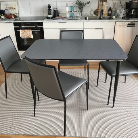 Väl använt, benen är slipade, har inte slipat resten men det kan man göra för att fräscha upp. Några märken på skivan, se bild