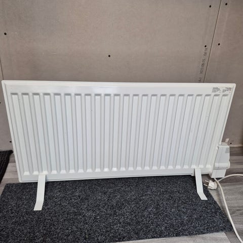 Elektriskt element i vit färg med termostat och strömbrytare. Har en ribbad frontpanel och är avsedd för uppvärmning av mindre utrymmen. Produkten är försedd med varningsmärkning om att inte täcka elementet.