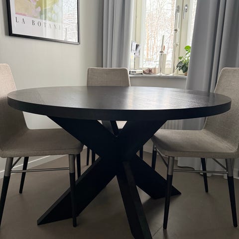 Säljer vårt matbord då det tyvärr är för stort för vår nya lägenhet. Köpt på Chilli för ca 2 år sedan, nypris är 4,000kr fortfarande. Har ytliga repor i mitten på bordet men är i övrigt fint skick! Man får plats som mest 6st stolar runt, vi brukar ha 4-5st.