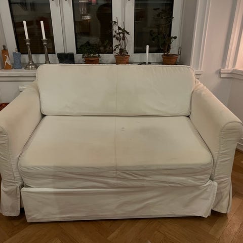 Mörkgrå Bäddsoffa från IKEA. Den är väl använd och ena sitsen har åkt ner en aning men kan nog åtgärdas enkelt med skruvar!