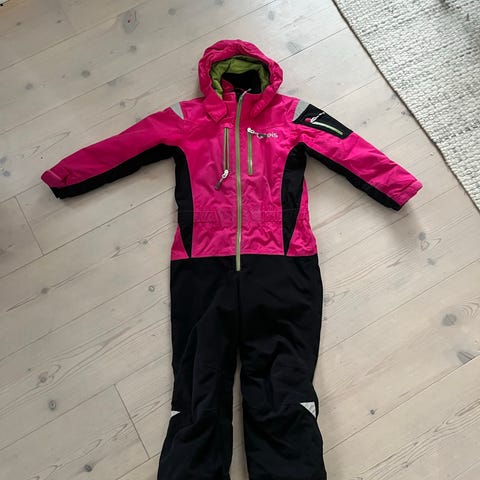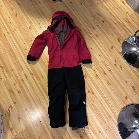 Ruggad på knäna och med små hål som lätt kan sys igen. Behöver nya band nertill att dra under stövlarna.