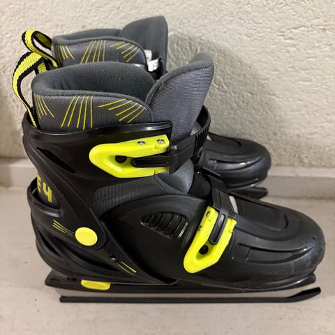 Barnskridskor i ställbar storlek 33-36 med svart och turkos färg. Mjuka på insidan. Sparsamt använda.
