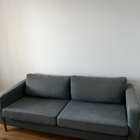 Skön grå tygsoffa med hjul