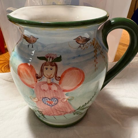 En tekanna i Deruta-keramik med "Raffaellesco"-mönster. Köpt på Ischias/ Italien någon gång på 50-talet.