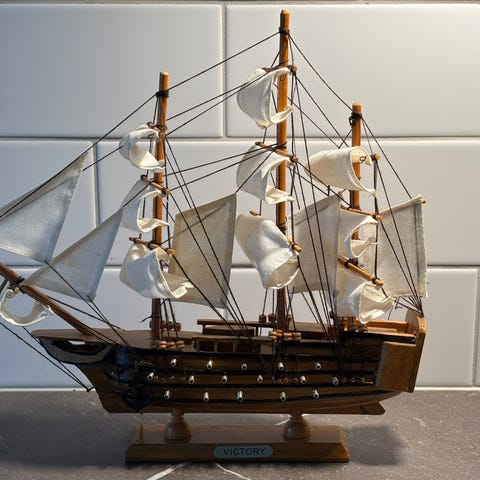 Modellsegelbåt tillverkad i trä med flera segel. Detaljerad konstruktion med rigg och segel i ljus färg. Passar som dekorativ modell eller samlarobjekt. Längd ca60 cm Höjd ca50