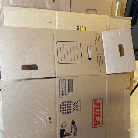 45 (kanske någon mer) flyttkartonger i olika skick, använda 1-3ggr. Från ÖB, Biltema, IKEA.