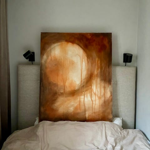 Målning med motiv av blommor i olika färger på grå bakgrund. Konstverket är målat med och visar en samling blommor i rött, gult, vitt och grönt.