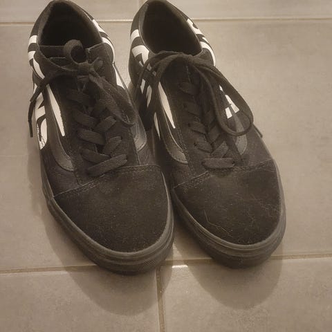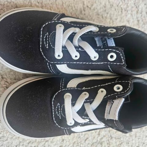 Vans barnskor i storlek 30,5 unisex. Skorna är svarta med broderade blommönster i flera färger. Tillverkade i textilmaterial med gummisula. Använda ca två gånger, inköpta i Los Angeles