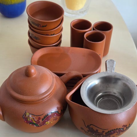 Setet inkluderar en tekanna med lock, en mjölkkanna och en skål.