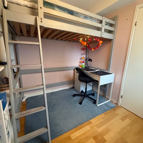 Säljer loftsäng från Mio . En madrass som på bilden ingår , för översängen blir det för hög , så vi har använt den som på bilden . Hämtas i Jordbro.