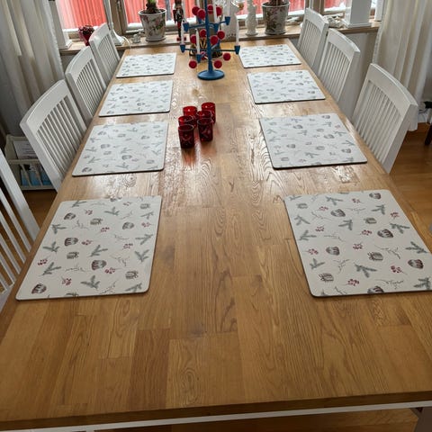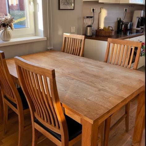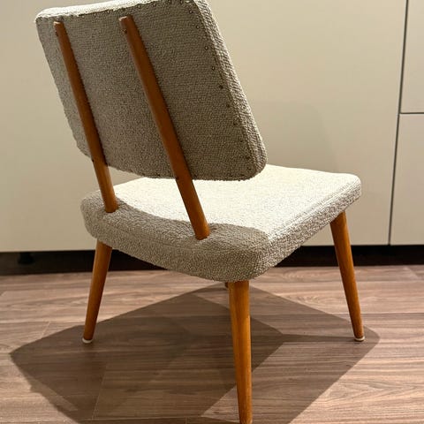 Subtilt rutigt mönster på den renoverade (ca 15 år sedan) och stoppade sitsen. Tvättade häromdagen med möbeltvätt, vilket gjort att en del små fläckar framträtt mer än innan de tvättades. Men de är ändå nytvättade 🤔. Troligen teak på ryggstödet med träplugg. Svartmålat i övrigt. Massiv och rejäl men ändå lätta och formen gör dem bekväma att sitta på också längre stunder. Det är dags för nytt liv för dessa trotjänare som förtjänar nytt liv. Vill du renovera eller behålla dem som de är?