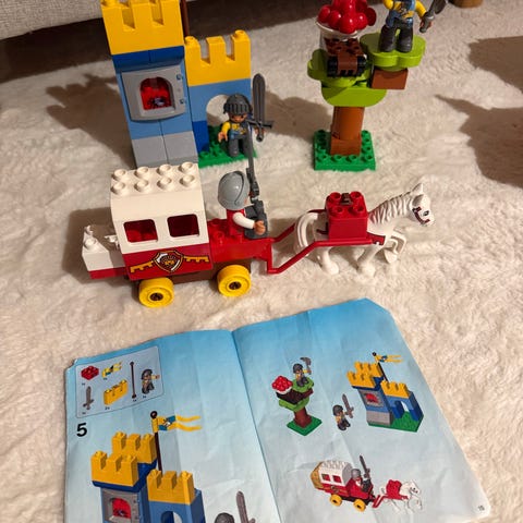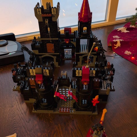 LEGO slott med riddare och drakar. Setet innehåller flera byggbara slottstorn, riddare med vapen och två röda drakar. Passar för barn och samlare som är intresserade av medeltida teman.