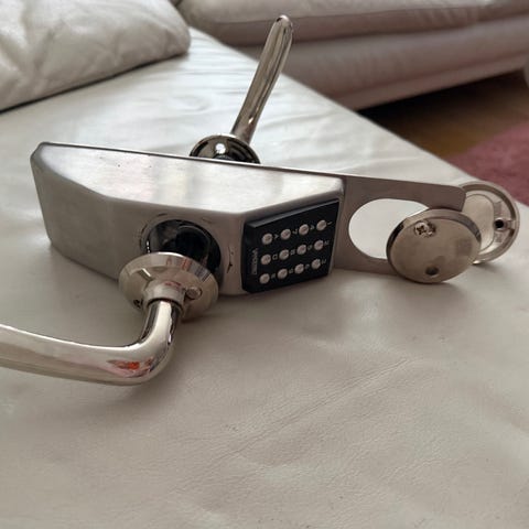 Digitalt dörrlås med kodfunktion. Enhet med knapptryck för inmatning av kod och handtag för öppning. Färg i svart och metall. Passar för användning på dörrar där kodstyrd åtkomst önskas.
