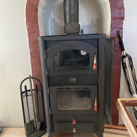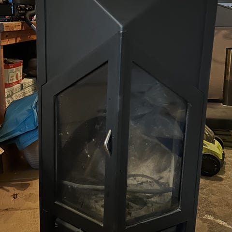 Braskamin med glasdörr och tillhörande rökrör. Designad för installation i hörn med stort glasfönster för insyn till elden. Säljer för 8000 kr.