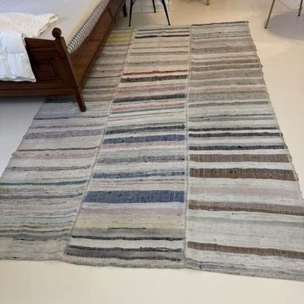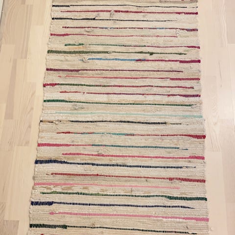 Vävd och unik rektangulär matta. Återvunnen 85% polyester, 12% bomull, 2% viscose, 1% elastan.
