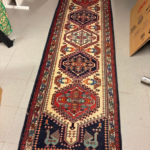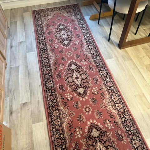Elegant röd matta i orientinspirerad stil, maskinvävd i extra hög kvalitet. Mått ca 190 × 110 cm. Tätvävd och slitstark med vackra blom- och symboldetaljer i blått, grått, vitt och vinrött.