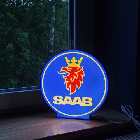 Saab lampa med bakgrund LED-belysning. Lampan visar Passar för väggmontering och används som dekorativ belysning.